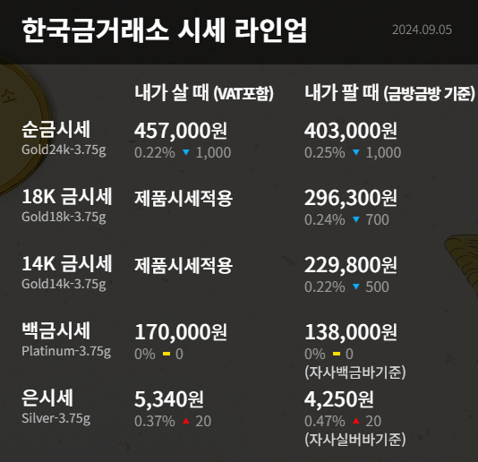 24k금시세 기준 금값시세는 3.75g당 그 전날 마감 시세보다 1,000원 하락한 457,000원/3.75g(1돈, 한돈)을 기록하고 있습니다.