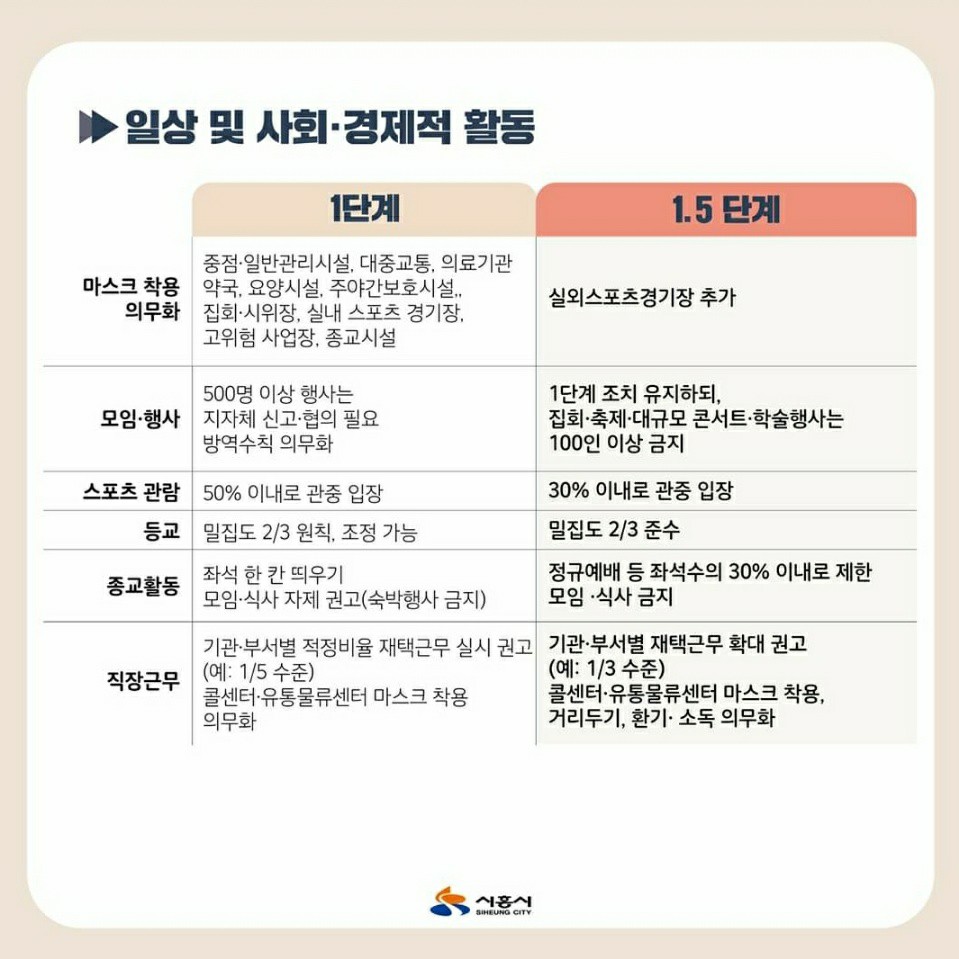 일상 및 사회.경제적 활동 1단계에서 1.5단계 격상에 따른 조치사항