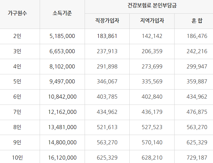 건강보험료 본인부담금에 의한 기준중위소득 150% 이하 판정기준