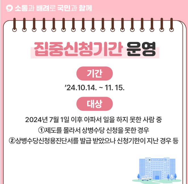 (대상) 2024년 7월 1일 이후 아파서 일을 하지 못한 사람 중 ①제도를 몰라서 상병수당 신청을 못한 경우 ②상병수당신청용진단서를 발급 받았으나 신청기한이 지난 경우 등 상병수당을 신청하지 못한 사람