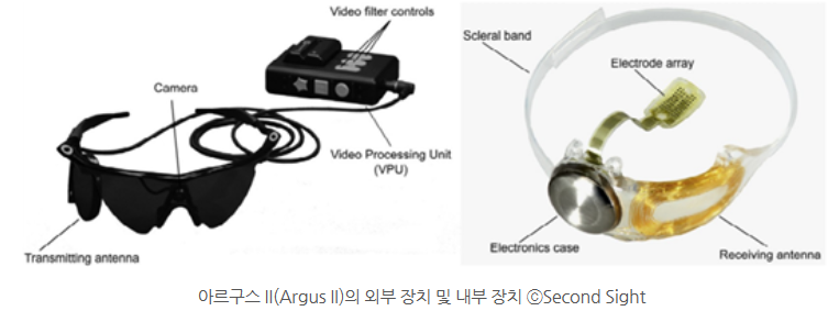 미국 Second Sight 사의 아르구스 II(Argus II)는 시각 정보를 제공하는 망막 보철물로, 미국 식품의약품(Food and Drug Administration, FDA)에서 유일하게 승인받은 인공 망막입니다. 아르구스 II(Argus II)는 외부 장치인 소형 카메라, 비디오 처리장치와 내부 장치인 안구에 이식하는 전극 그리고 장치들을 연결하는 송신구로 이우러져 있습니다.