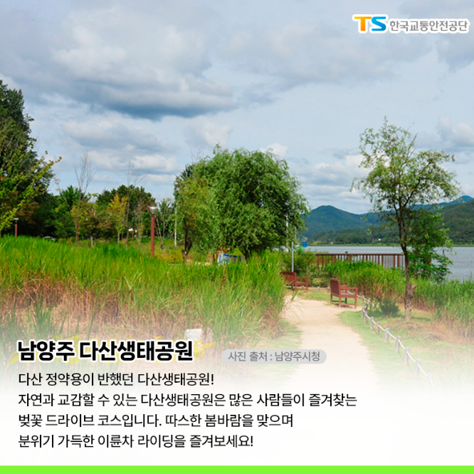 자연과 교감할 수 있는 다산 생태공원은 많은 사람들이 즐겨 찾는 벚꽃 드라이브 코스입니다. 따스한 봄바람을 맞으며 분위기 가득한 이륜차 라이딩을 즐기면 좋을 것 같습니다.
