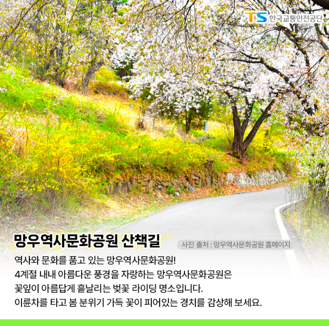 4계절 내내 아름다운 풍경을 자랑하는 망우역사문화공원은 꽃잎이 아름답게 흩날리는 벚꽃 라이딩 명소라고 합니다.