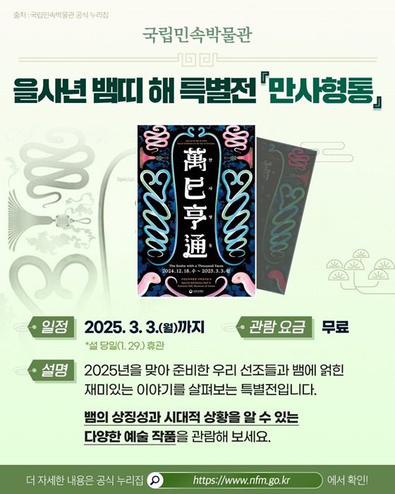 👉 2025년을 맞아 준비한 우리 선조들과 뱀에 얽힌 재미있는 이야기를 살펴보는 특별전이라고 합니다. 뱀의 상징성과 시대적 상황을 알 수 있는 다양한 예술 작품을 관람해 보시기 바랍니다.