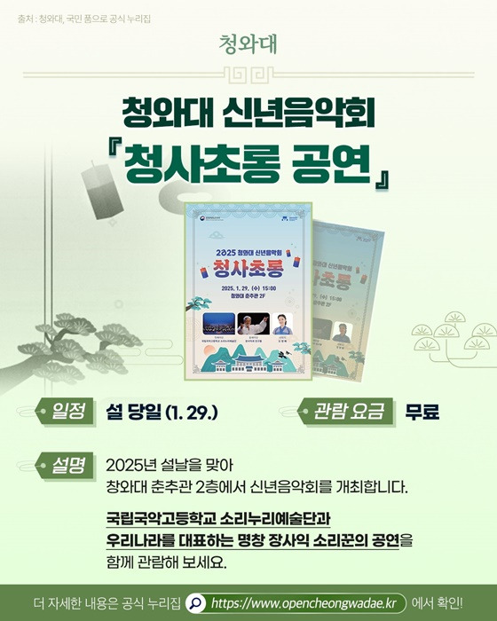 👉 2025년 설날을 맞아 청와대 춘추관 2층에서 신년음악회를 개최한다고 합니다. 국립국악고등학교 소리누리예술단과 우리나라를 대표하는 명창 장사익 소리꾼의 공연을 함께 관람해보시길 바랍니다.