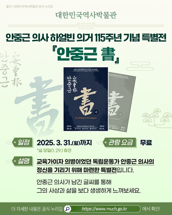 👉 교육가이자 의병이었던 독립운동가 안중근 의사의 정신을 기리기 위해 마련한 특별전이라고 합니다. 안중근 의사가 남긴 글씨를 통해 그의 사상과 삶을 보다 생생하게 느껴보시면 좋을 것 같습니다.