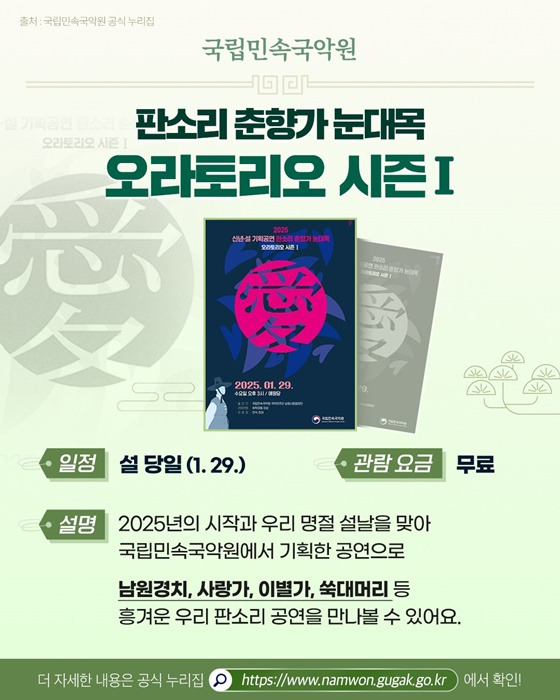 👉 2025년의 시작과 우리 명절 설날을 맞아 국립민속국악원에서 기획한 공연으로 남원경치, 사랑가, 이별가, 쑥대머리 등 흥겨운 우리 판소리 공연을 만나볼 수 있다고 합니다.