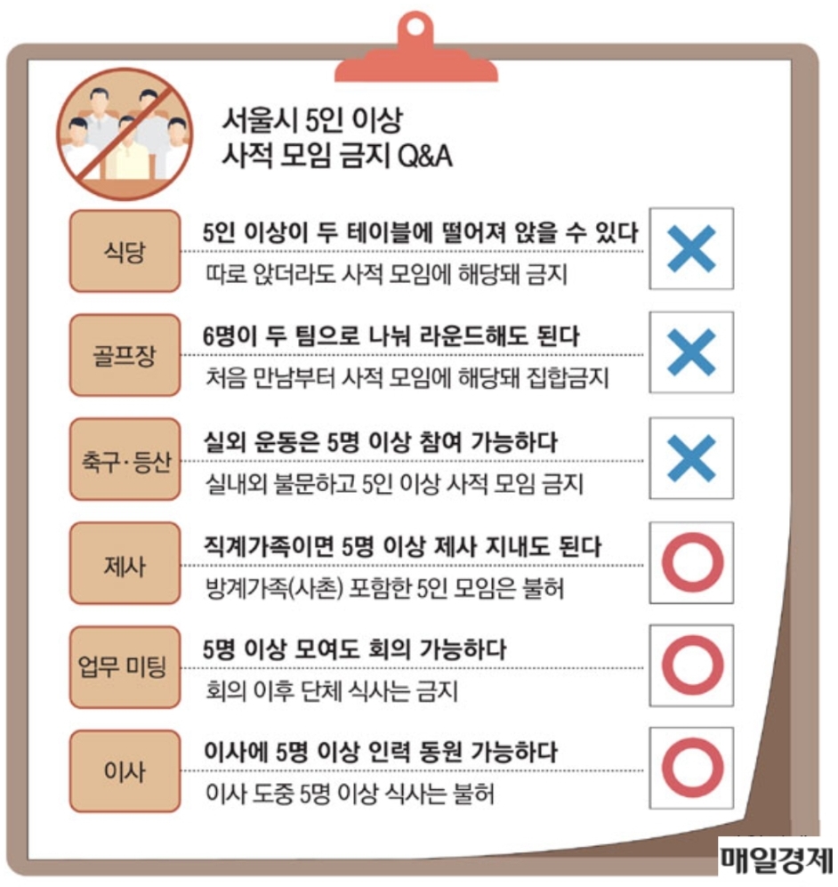 집합활동, 동창회, 동호회, 야유회, 송년회, 신년회, 온라인카페 정모, 직장회식, 워크숍, 집들이, 돌잔치, 회갑·칠순연 등의 모임 외 사적 모임 일체금지