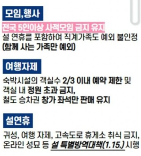 2. 설명절 연휴기간동안 직계가족이라도 거주지가 다르면 4명까지만 모임이 가능함(위반시 10만원 과태료)