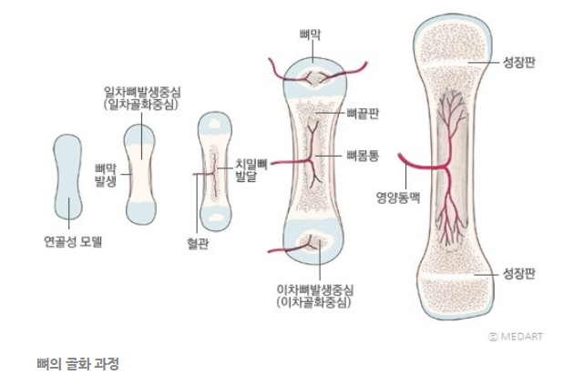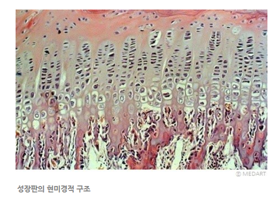 이곳의 연골세포가 증식, 성숙, 석회침착, 모세혈관 침투, 뼈 침착과정이 일어나면서 뼈의 길이성장이 이루어 지는 것이라고 합니다.