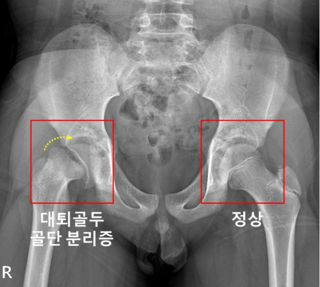 대퇴골두 골단 분리증은 대퇴골 위쪽 성장판 부위에서 대퇴골두와 그 아래의 뼈가 특별한 외상 없이 분리되는 병이라고 합니다. 진단이 지연될 경우, 대퇴비구 충돌증후군 혹은 대퇴골두가 썩는 대퇴골두 무혈성 괴사가 발생할 수 있다고 합니다.