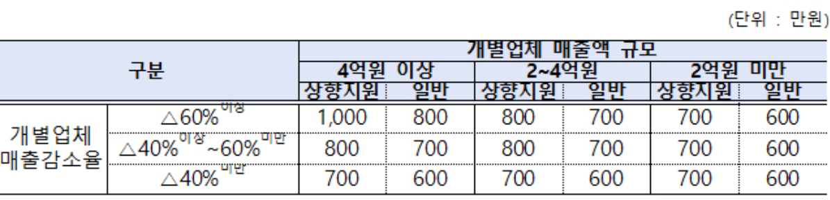 중기부는 개별 업체의 매출액 규모 및 매출 감소율에 따라 9개 구간으로 구분해 최소 600만 원, 최대 800만 원을 지급합니다.