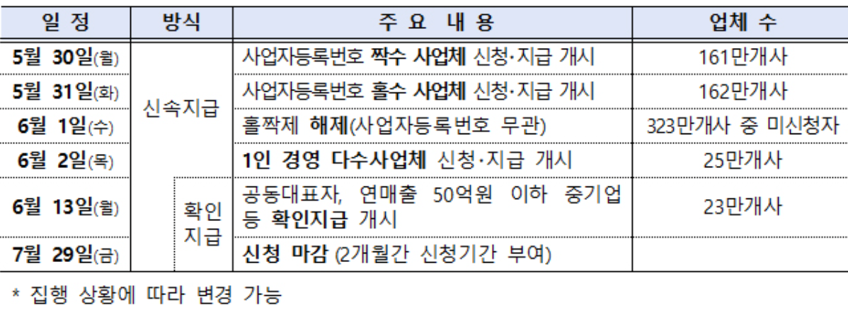 1명이 여러 사업체를 경영하는 25만 곳의 경우에는 다음 달 2일 신청과 지급이 시작되고 안내문자도 다음달 2일 발송됩니다.