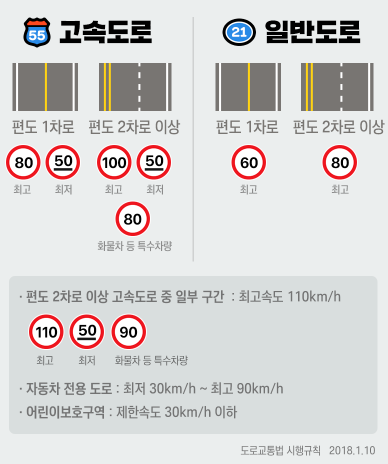 위의 그림은 주행도로별 제한 속도를 정리한 것입니다. 위 그림을 참고하여 이제 내비게이션에 100% 의지하지 않더라도 주로 주행하는 도로의 제한 속도를 숙지해서 과속하지 않으면 좋을 것 같습니다.