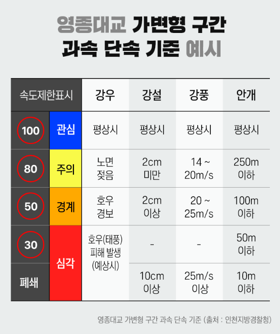 위의 표는 영종대교 가변형 구간 과속 단속 기준을 정리한 표입니다. 영종대교처럼 가변형 속도제한표지가 있는 도로에서는 날씨에 따라 변경되는 '가변형 속도제한표지'에 표시된 제한 속도를 따라야 합니다.