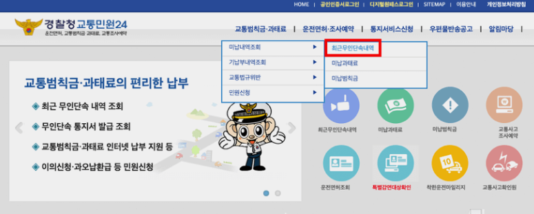 메인 홈페이지 우측 상단 '교통 범칙금·과태료> 미납 내역 조회> 최근 무인단속내역'을 클릭합니다.
