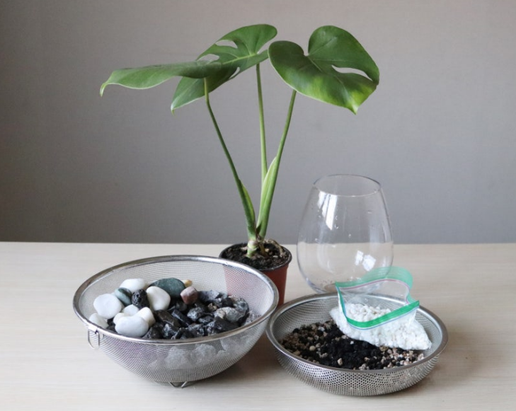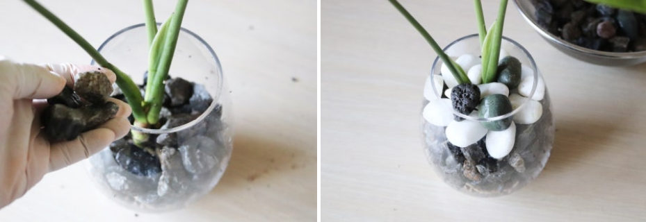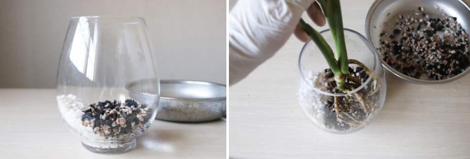 3. 유리볼 바닥에는 입자가 작은 마사토나 화산석을 깔아주고 몬스테라를 올려 위치를 잡아줍니다. 이때 색깔이 대비되는 장식돌의 기울기를 주어 전면과 후면에 경사를 주면 전체적인 단조로움을 피할 수 있는 좋은 연출이 될 수 있습니다.