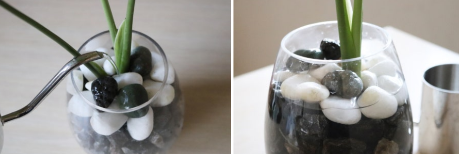 5. 유리볼 안에 물을 넣어줍니다. 윗 자갈이 살짝 잠길 정도로만 부어주면 됩니다. 물은 정수되지 않은 수돗물을 사용해야 물속에 있는 미네랄 등의 영양을 공급할 수 있으며 물 수위가 낮아졌을 경우 물을 추가로 보충하는 방법으로 물관리를 하면 됩니다.