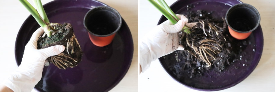 1. 흙에 심어져있는 몬스테라는 포트에서 꺼내 흙을 대충 털어줍니다.