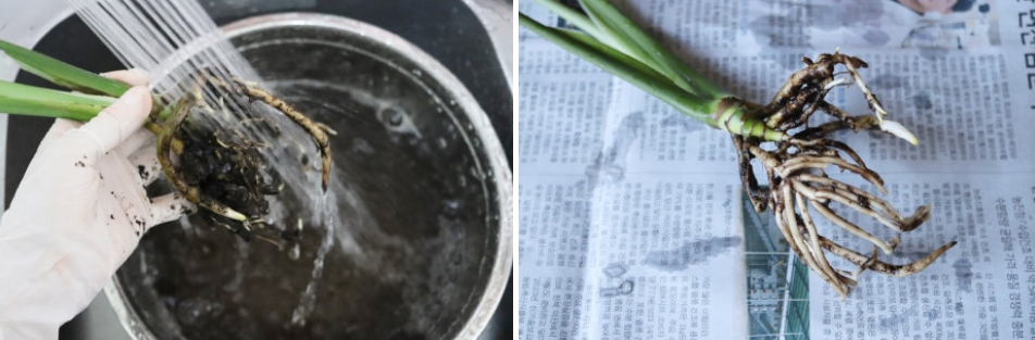 2. 흐르는 물로 뿌리에 묻어있는 흙을 꼼꼼히 제거해 줍니다.
