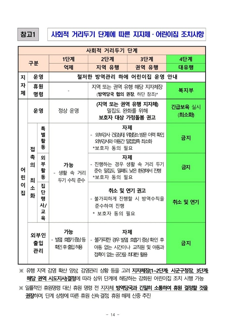 사회적 거리두기 단계에 따른 지자체·어린이집 조치사항