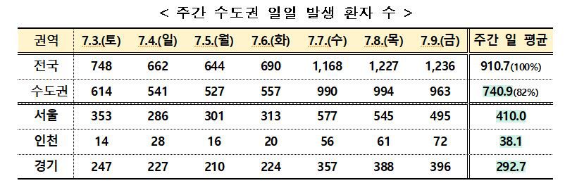 7월 3일부터 9일까지의 수도권 일일 확진자 수
