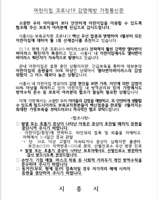 | 어린이집 긴급보육을 이용하시는 보호자 등 가구당 1인 선제검사 안내문 (0) | 2021.07.24 |