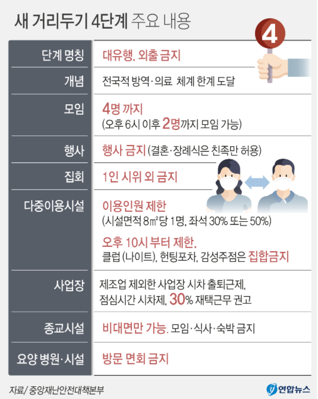 4단계에서는 저녁 6시 이전에는 4명까지, 6시 이후에는 2명까지만 모임이 허용된다고 합니다.