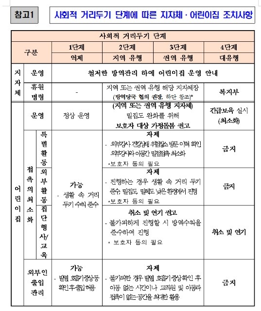 사회적 거리두기 단계에 따른 지자체·어린이집 조치사항