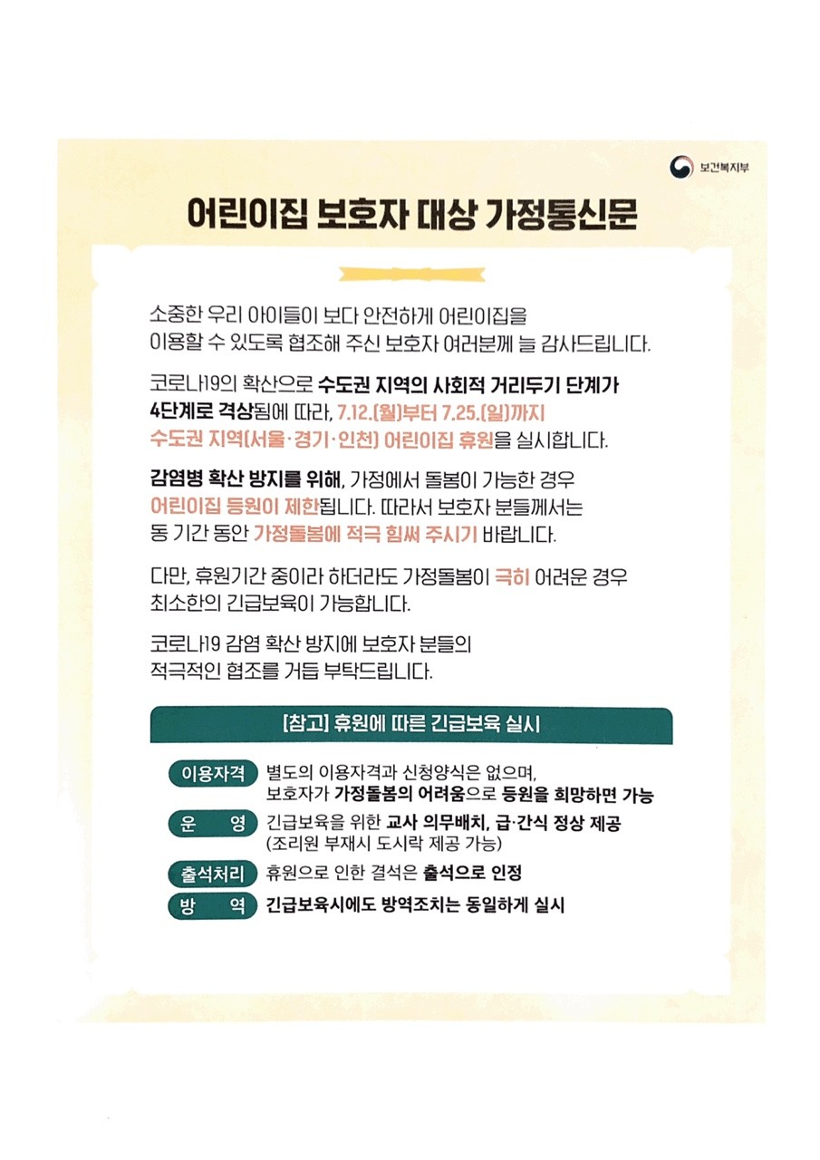 | 4단계 수도권 어린이집 휴원 실시 안내문 (0) | 2021.07.09 |