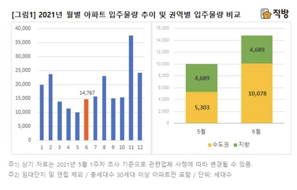 31일 직방에 따르면 6월 아파트 전국 입주 물량은 28개 단지, 총 1만4천767가구로 전달인 5월 9천 992가구에 비해 물량 대비 약 47.8% 나 많다고 합니다.