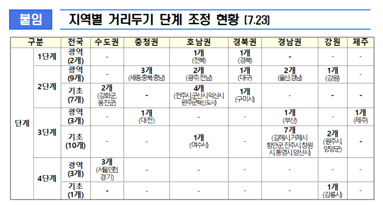 전해철 중앙재난안전대책본부 2차장 (행정안전부 장관)은 7월 23일 중대본 회의 모두발언을 통해 "4차 유행 상황을 종합적으로 고려해 수도권 지역에 적용 중인 현행 사회적 거기두기 4단계를 연장한다"면서 "오후 6시 이후 3인 이상 사적 모임 금지도 앞으로 2주간 연장한다"고 밝혔다고 합니다.