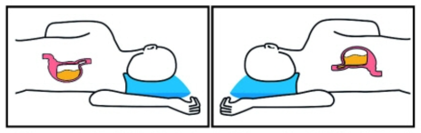 위식도 역류질환이 있는 경우에 수면 자세에 따라서 영향을 받을 수 있습니다. 사람의 위는 몸 왼쪽에 있습니다. 따라서 왼쪽으로 돌아누워서 잠을 자면 위가 몸의 아래쪽으로 내려가게 됩니다. 그렇게 되면 중력에 의해서 위산은 아래쪽에 있고, 위쪽으로 올라가기 때문에 위산이 역류할 수 있습니다. 위는 몸 왼쪽이 있기 때문에 위가 아래쪽으로 내려가는 왼쪽으로 돌아누워서 자는 자세가 위식도 역류질환이 있는 사람들에게 더 도움이 될 수 있다고 합니다.