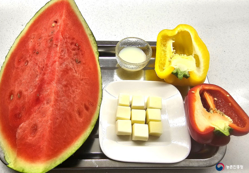 수박 1/4통, 에멘탈 치즈 큐브 9개, 노란 파프리카 1/2개, 빨간 파프리카 1/2개, 연유 2T