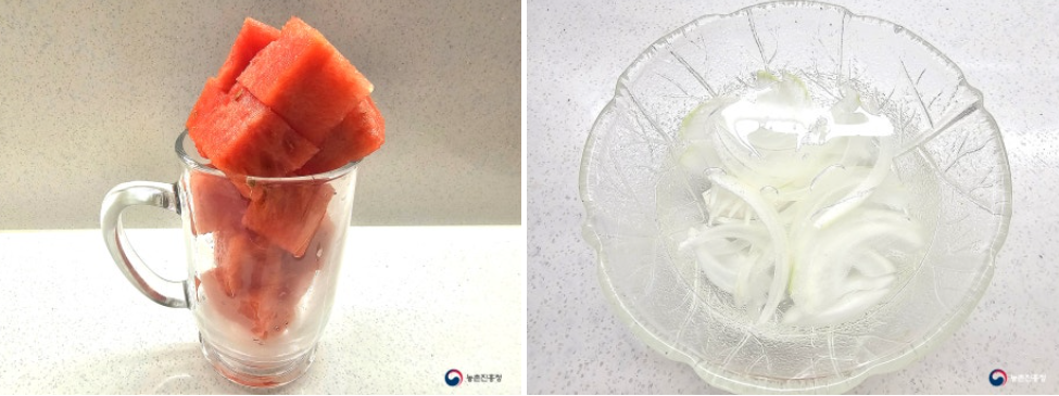 1. 수박 2컵은 씨를 제거해 약 2cm 네모 모양으로 잘라줍니다. 양파 1/4개는 매운맛을 제거하기 위해 얇게 채 썬 뒤 물에 담가줍니다.