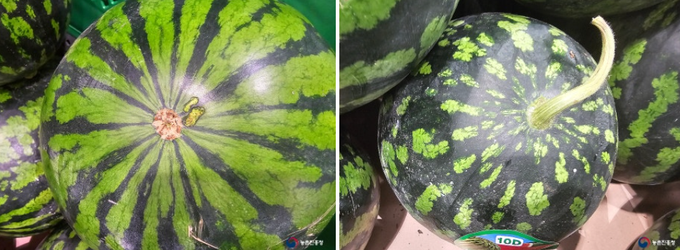 일반적으로 하우스에서 촉성 재배해 조기출하되는 수박은 연한 연두색을 띠고 있다고 합니다.