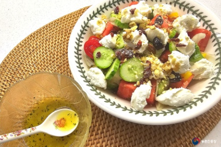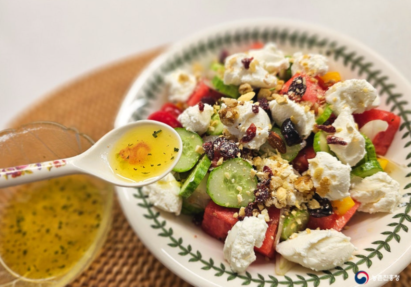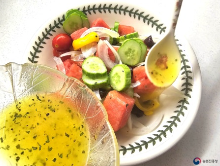 7. 먹기 직전, 나머지 드레싱 소스를 부어주면 수박 리코타 치즈 샐러드가 완성입니다.
