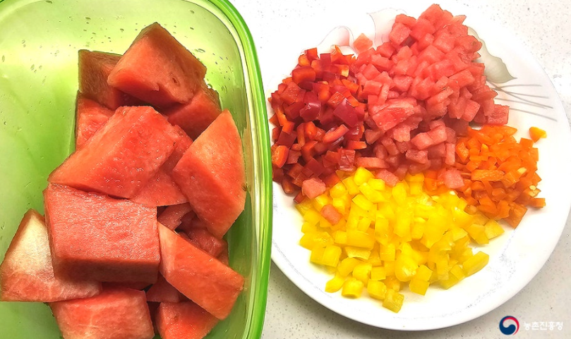 2. 수박 1/4통의 절반은 씨와 껍질을 제거하고 파프리카와 같은 크기로 잘라준 뒤 냉장고에 넣어줍니다.