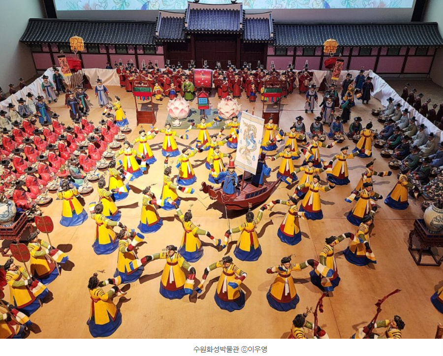 이 전시실에서는 1795년 정조의 8일간 행차 때 거행한 행사를 미니어처와 관련 유물을 통해 전시합니다. 1795년에 정조 어머니 혜경궁홍 씨 회갑잔치를 사도세자 능이 있는 화성에서 진행했습니다.