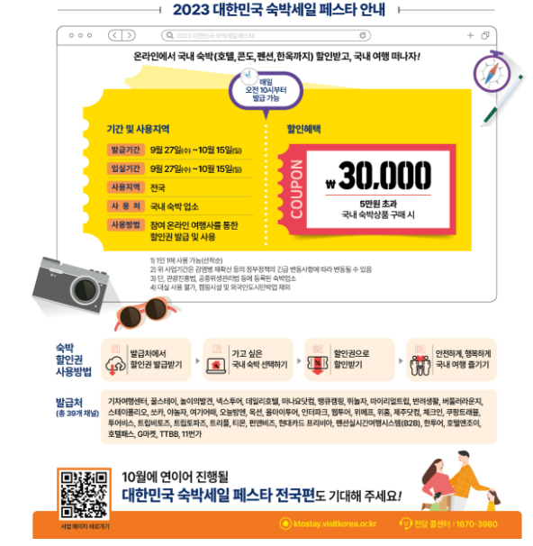 추석 연휴 및 한국방문의 해와 함께하는 2023 대한민국 숙박세일 페스타 : 대한민국 구석구석 (visitkorea.or.kr)