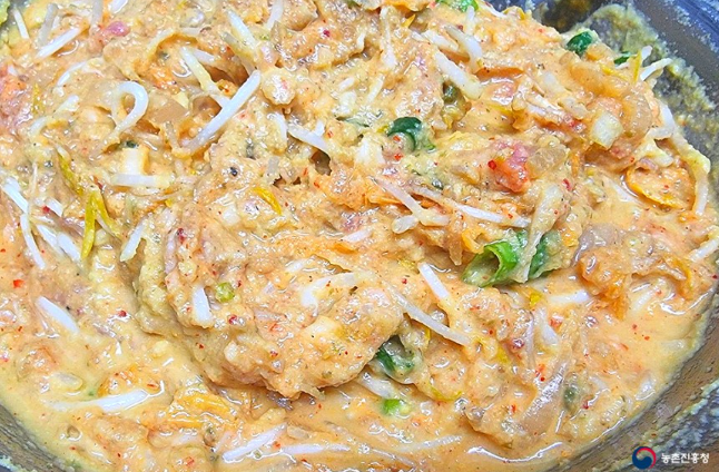 녹두를 불려 간 다음 기른 숙주나물과 김장김치, 달걀, 돼지고기를 넣고 휙휙 저어 반죽을 만들어줍니다.