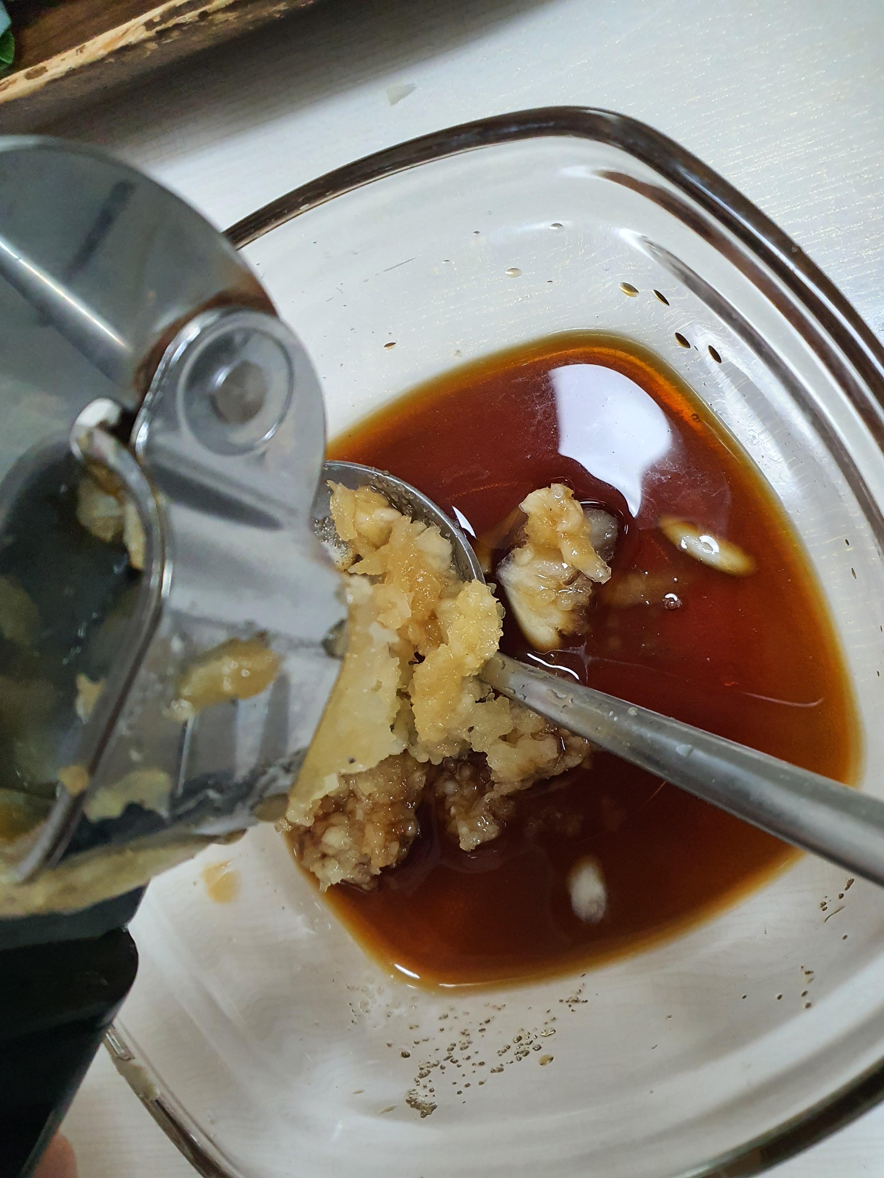 고기 밑간이랑 비슷한 재료지만 다시 양념장을 만들어 놓습니다. 진간장 2스푼, 굴소스 1스푼, 맛술, 2스푼, 설탕 1스푼, 후추 조금, 다진마늘 1스푼을 넣어 잘 섞어줍니다.