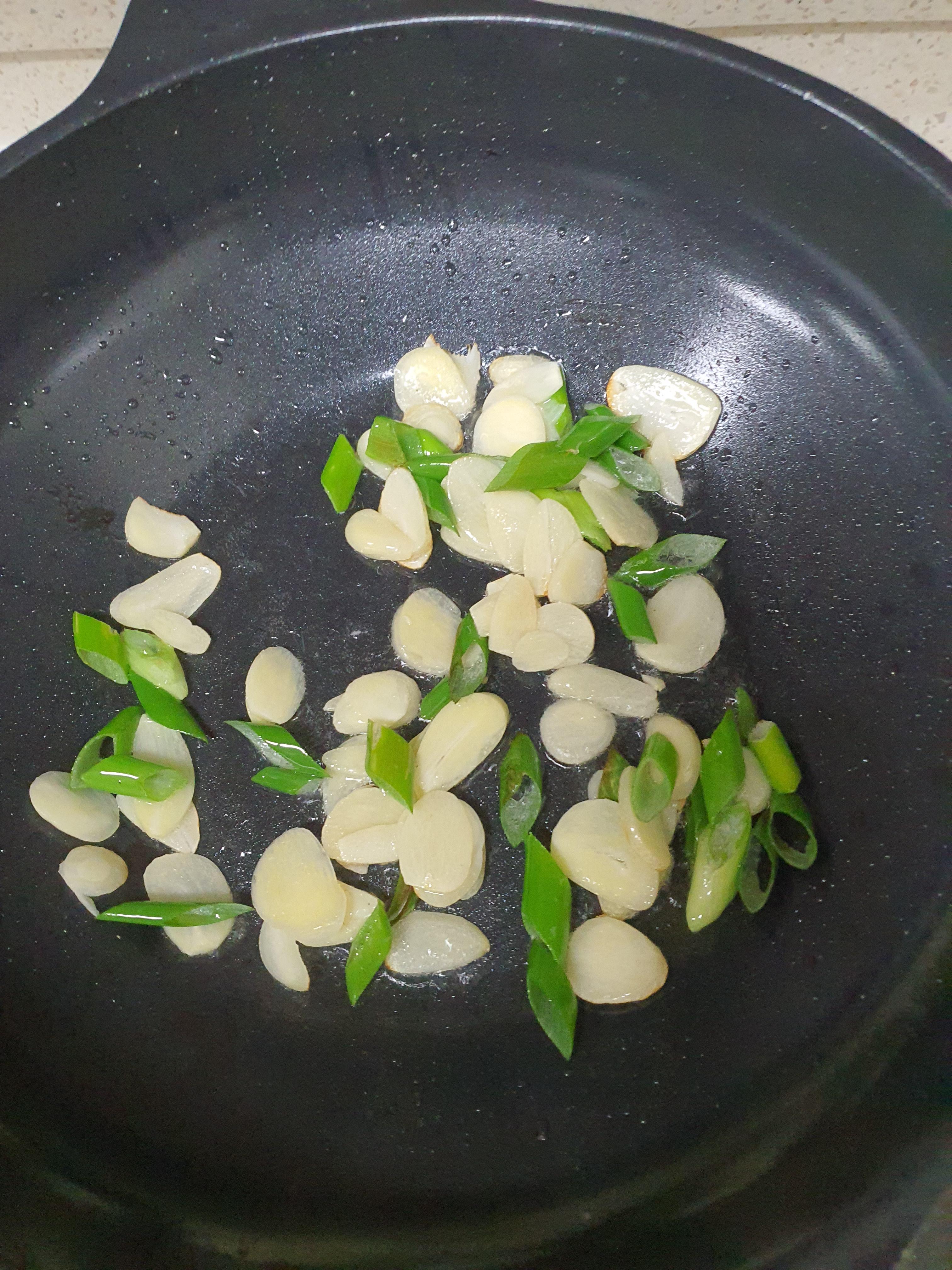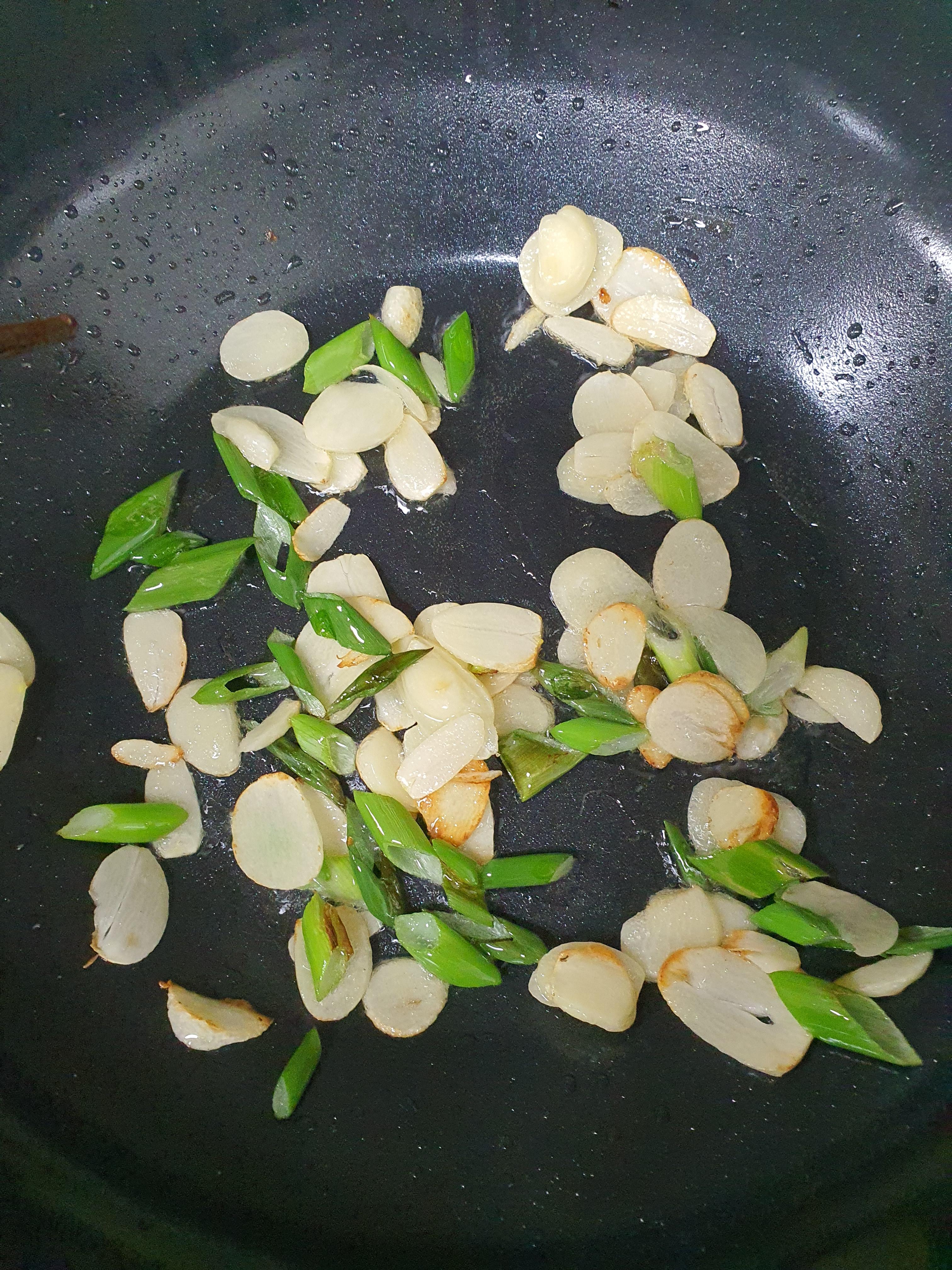 4. 달군 후라이팬에 식용유를 넣고 마늘과 파를 넣고 볶아줍니다.