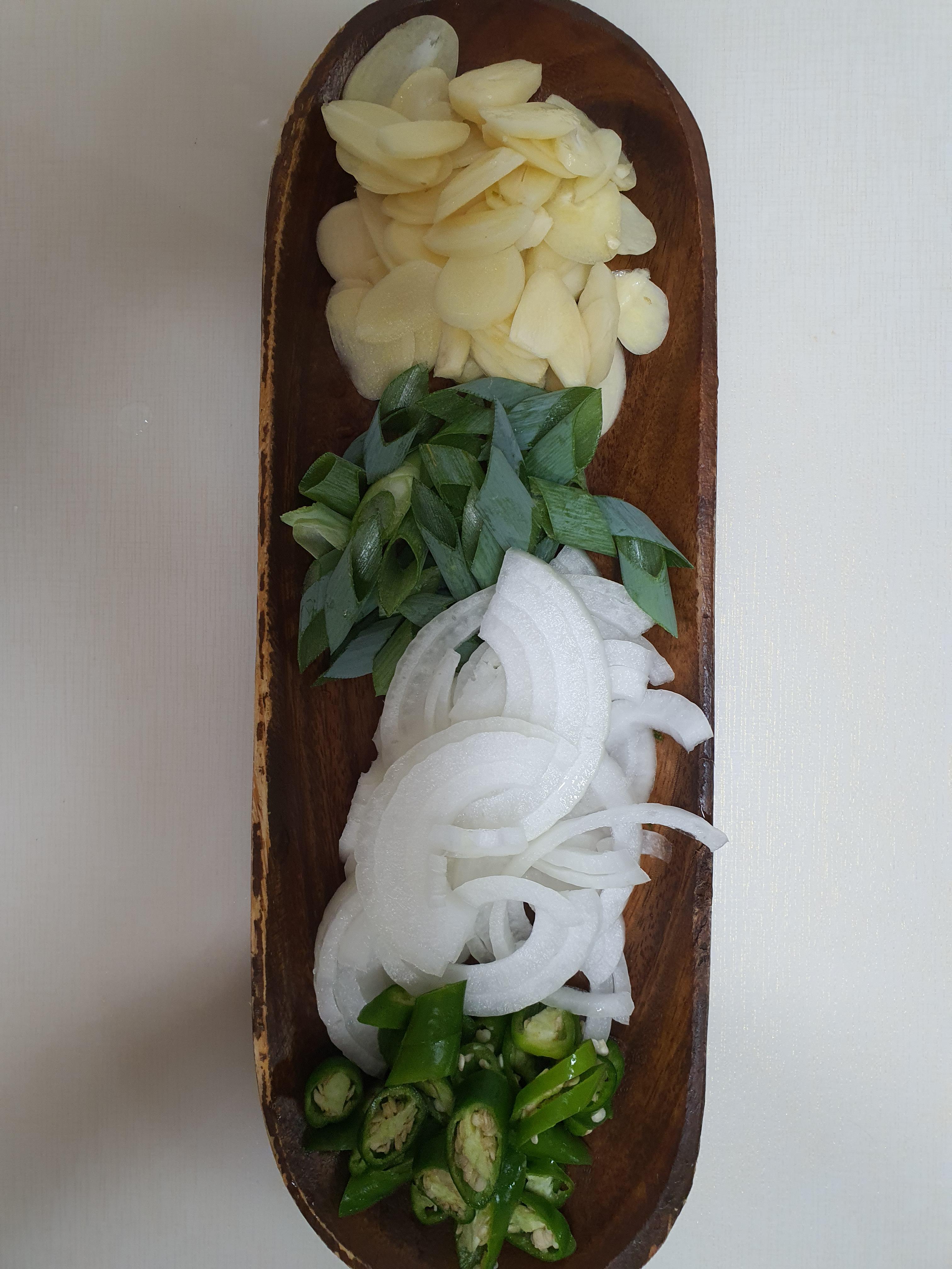 2. 파, 양파, 마늘, 고추 먹기 좋게 썰어두기