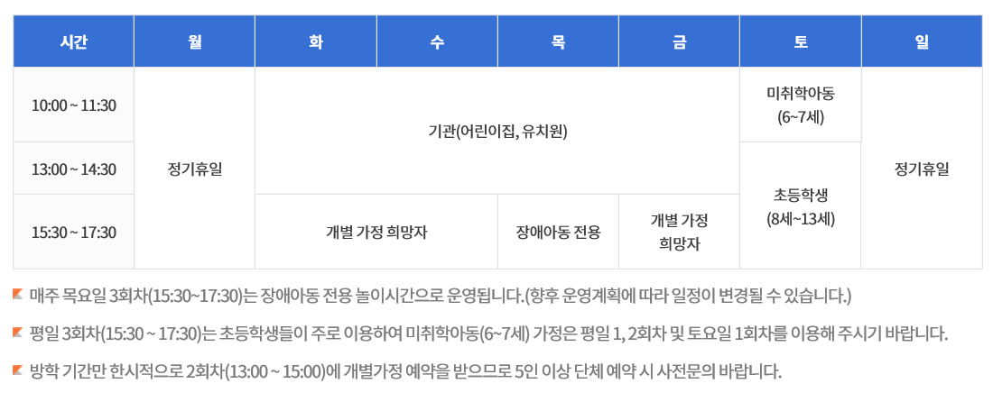 - 건강한 놀이문화 확산의 거점 공간이자 장애, 비장애 아동이 놀이로 서로 소통하고 함게 어울릴 수 있는 공공형 실내놀이공간입니다.