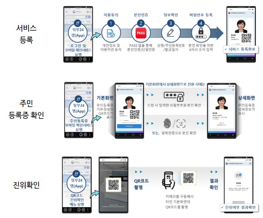 '정부 24'를 통해 본인 확인 절차를 거친 후, 신분확인번호(QR코드)와 주민등록증 수록 사항을 화면에 표시하여 본인의 신분을 확인시켜 주거나 또는 QR코드 촬영을 통해 진위여부를 확인하는 방식으로 이용학 된다고 합니다.