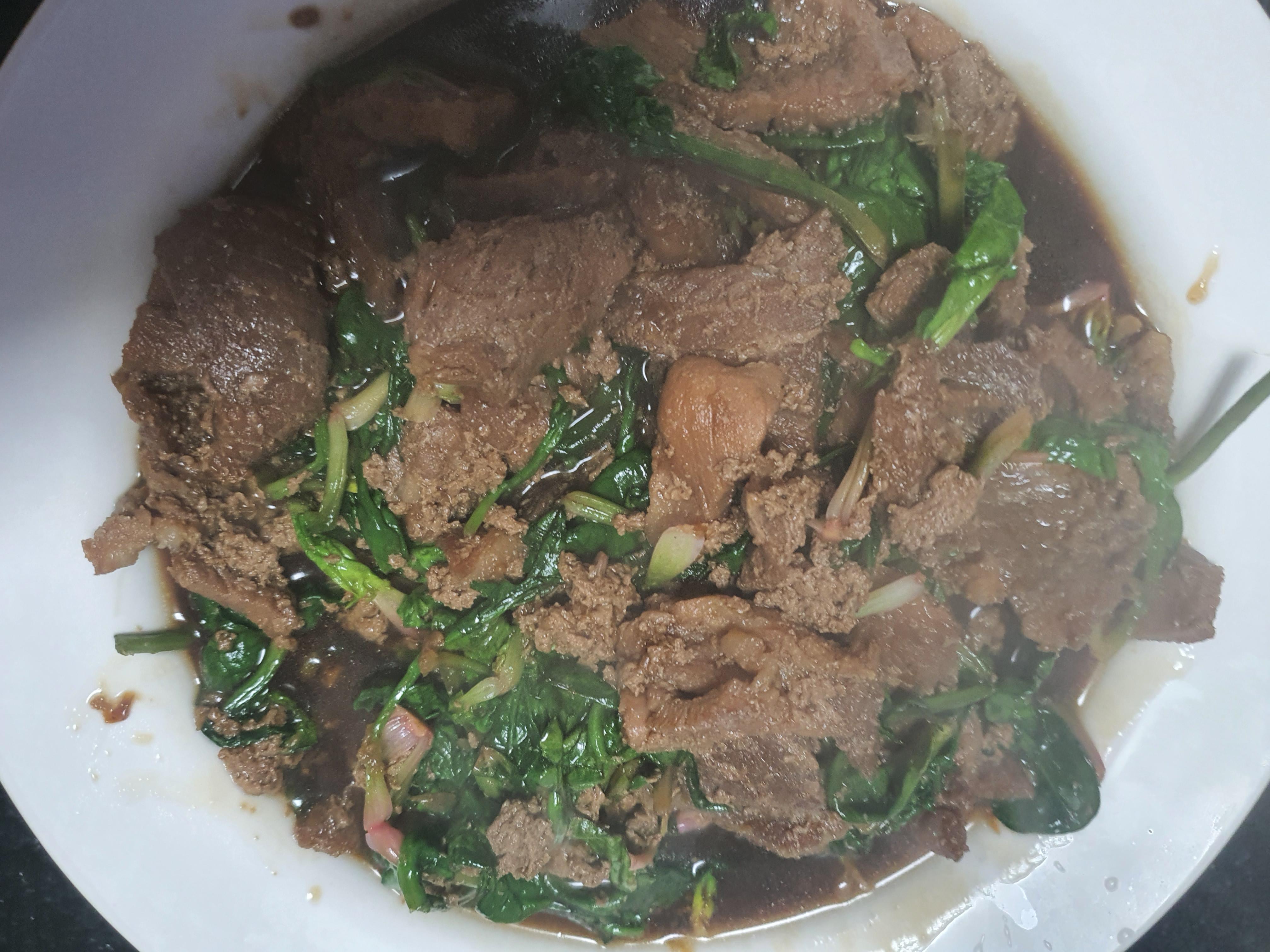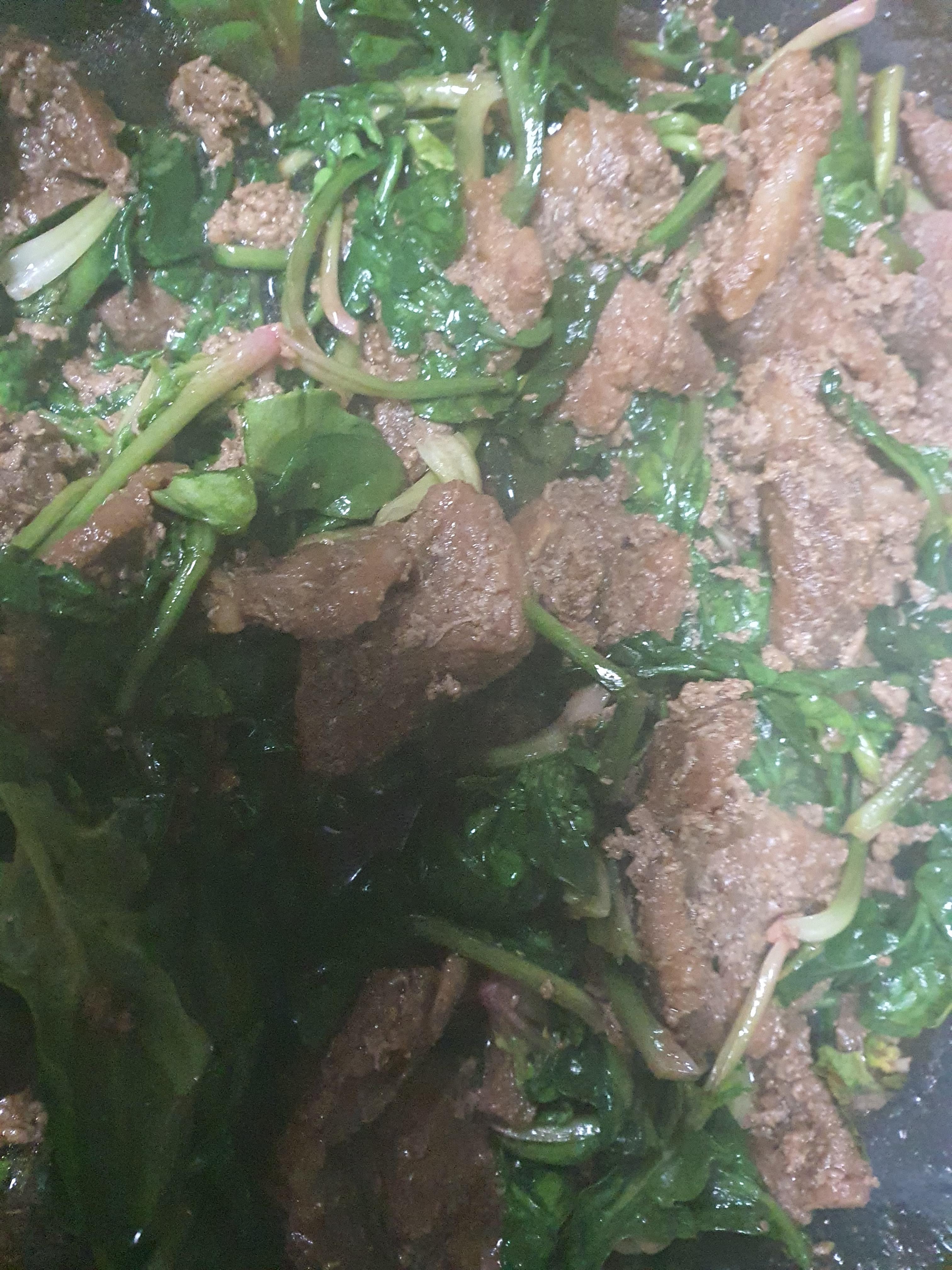 고기 한 점에 시금치 몇 줄 올려서 먹으니 아주 기가 막힙니다.