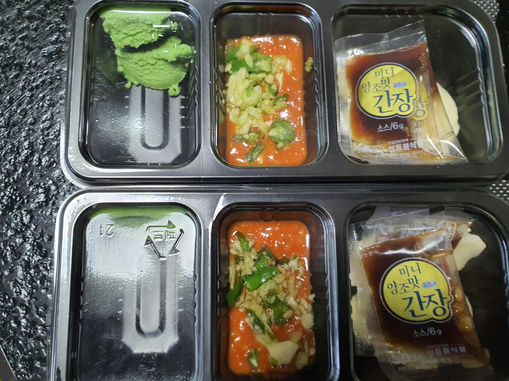 소스는 간장소스, 와사비, 편마늘, 양념이 잘 된 쌈장을 주셨어요