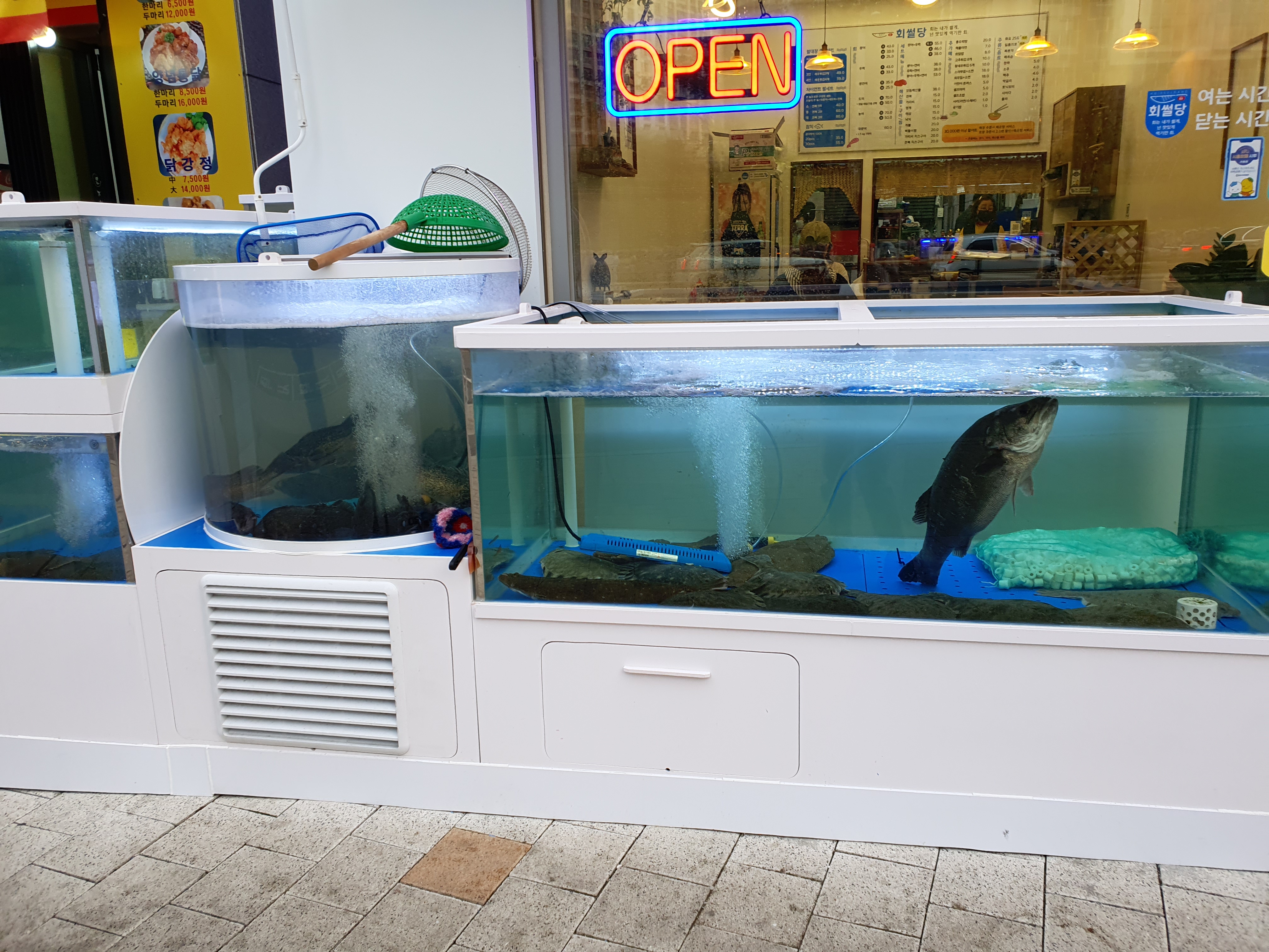 입구쪽에는 큰 어항이 있고 주문과 동시에 어항에서 잡아서 회를 썰어주신답니다.