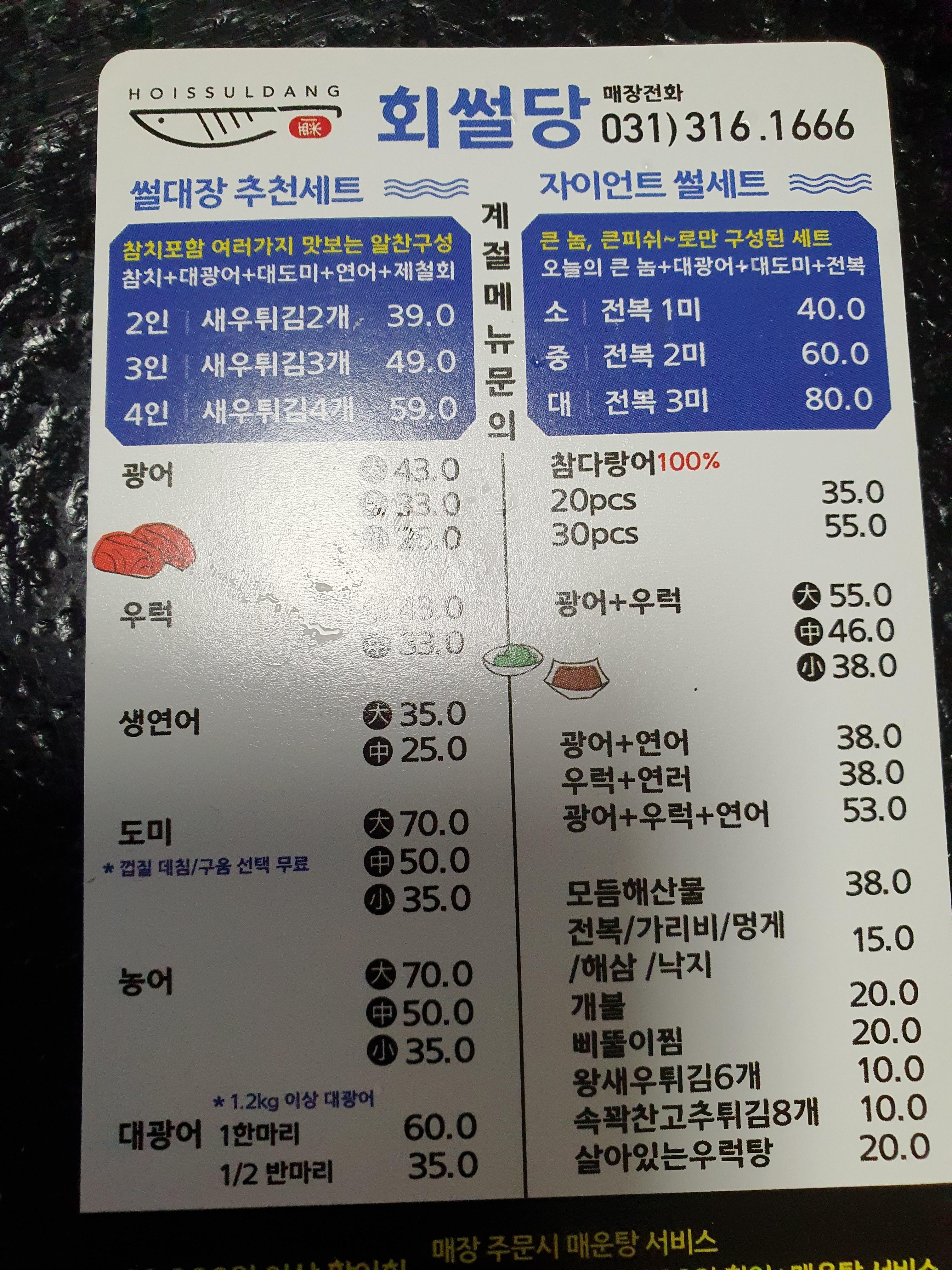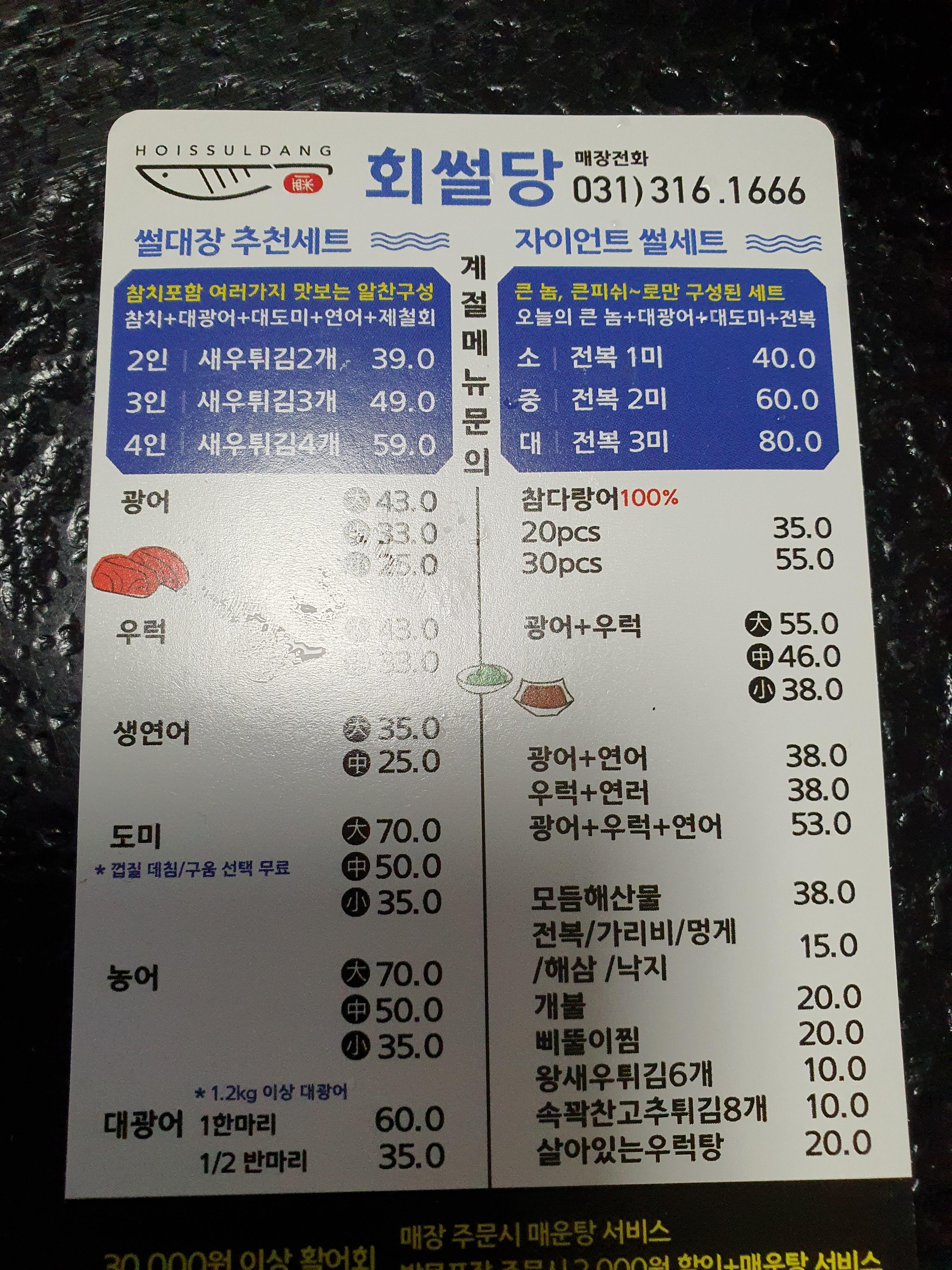 이곳 회썰당은 배달도 가능해서 전화 주문도 가능하답니다.
